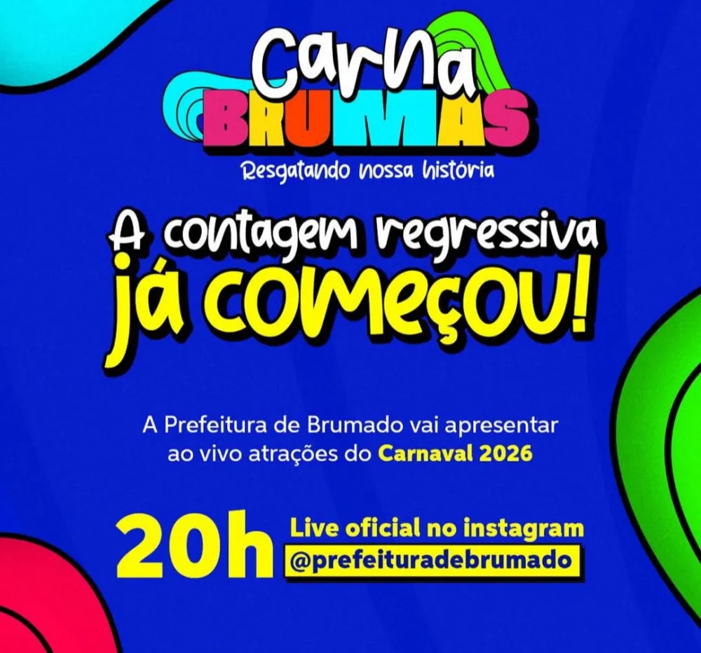 É hoje! A Prefeitura de Brumado realiza, nesta quinta-feira (29), a aguardada divulgação das atrações do Carnaval 2026. O anúncio será feito por meio de uma live, a partir das 20h, no perfil oficial do município no Instagram.